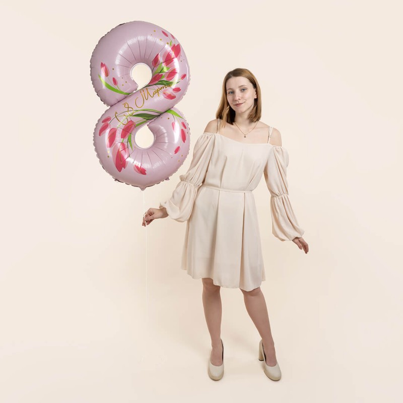 Шар цифра, 8 Марта, розовый с тюльпанами, высотой 86 см