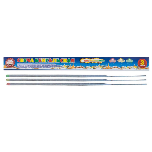 Искристые бенгальские огоньки – один из самых узнаваемых атрибутов праздника.Магия огня завораживающе преображает любое торжество, а ореол волшебных искорок наполняет праздничную атмосферу ожиданием чудес и весельем.Бенгальские свечи замечательно украсят Новый Год,а также любой другой праздник. Применение: Удерживайте изделие за свободную от пиротехнического состава часть в вытянутой руке или вертикально зафиксировав её в устойчивом основании. Не наклоняясь над ней подожгите верхний кончик. ОГНЕОПАСНО!Применять только на улице в безветренной атмосфере.Запрещено: использовать в состоянии опьянения, направлять свечу непосредственно на людей или предметы, радиус опасности не более 0,5м, производить с изделием любые действия, не предусмотренные настоящей инструкцией; использовать изделие с повреждениями или истекшим сроком годности, бросать в огонь. Хранить в сухом помещении, t° не выше +30С,вдали от приборов обогрева.
