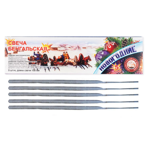 Искристые бенгальские огоньки – один из самых узнаваемых атрибутов праздника.Магия огня завораживающе преображает любое торжество, а ореол волшебных искорок наполняет праздничную атмосферу ожиданием чудес и весельем.Бенгальские свечи замечательно украсят Новый Год,а также любой другой праздник. Применение: Удерживайте изделие за свободную от пиротехнического состава часть в вытянутой руке или вертикально зафиксировав её в устойчивом основании. Не наклоняясь над ней подожгите верхний кончик. ОГНЕОПАСНО!Применять только на улице в безветренной атмосфере.Запрещено: использовать в состоянии опьянения, направлять свечу непосредственно на людей или предметы, радиус опасности не более 0,5м, производить с изделием любые действия, не предусмотренные настоящей инструкцией; использовать изделие с повреждениями или истекшим сроком годности, бросать в огонь. Хранить в сухом помещении, t° не выше +30С,вдали от приборов обогрева.