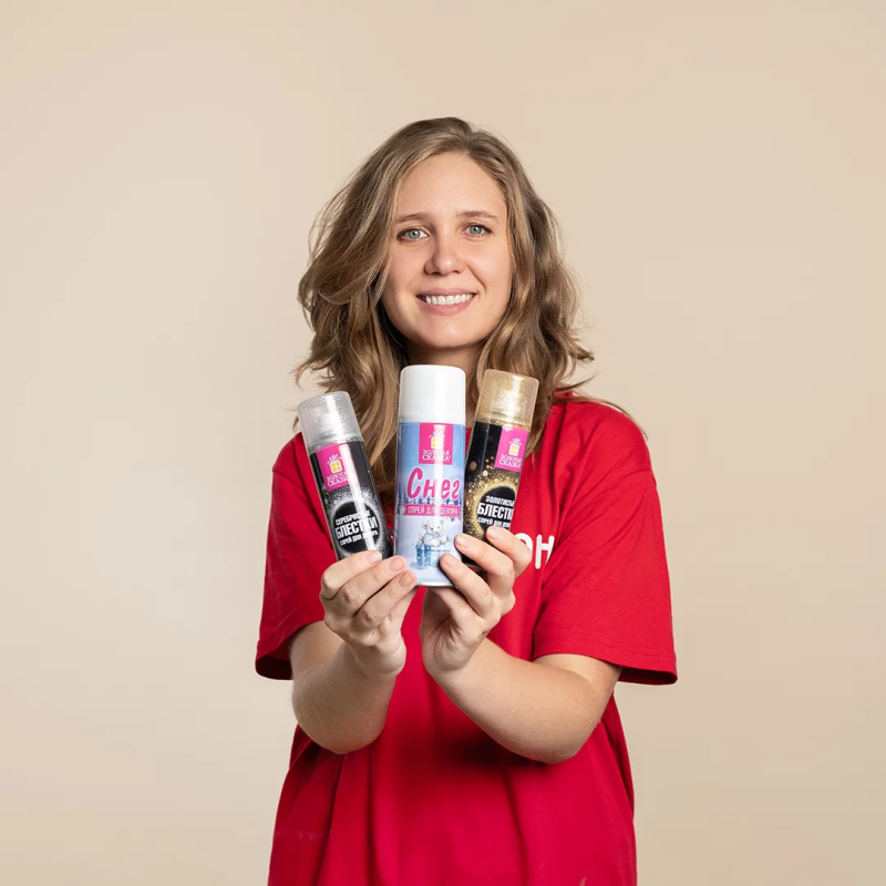 Представляет собой спрей-аэрозоль, в металлическом баллоне объемом 175 мл, из синтетических материалов, визуально имитирующих мелкие блестящие частички серебристого цвета. После нанесения блестки для декора не исчезают, а сохраняются на поверхности до удаления посредством механического воздействия (например, после стирания влажной тканью).