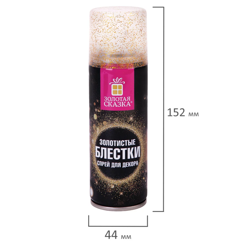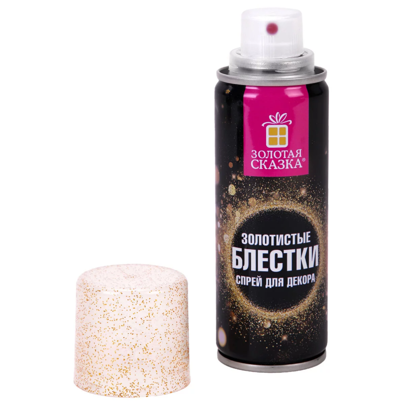 Представляет собой спрей-аэрозоль, в металлическом баллоне объемом 175 мл, из синтетических материалов, визуально имитирующих мелкие блестящие частички золотистого цвета. После нанесения блестки для декора не исчезают, а сохраняются на поверхности до удаления посредством механического воздействия (например, после стирания влажной тканью).