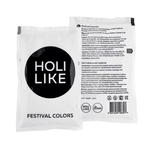С фестивальной краской Холи Вы сможете устроить яркий фейерверк красок, который сделает любой праздник волшебным. Краски холи HOLI LIKE – это цветные порошки на основе натуральных ингредиентов. Уличные игры с красками холи будут незабываемой игрой для взрослых и детей, которые оставят самые яркие впечатления и положительные эмоции. Цветные краски холи это отличное дополнение к любому празднику: на день рождения, свадьбу, любой другой праздник или просто отдых на природе и фотосессии. Фестивальная краска холи Holi Like непожароопасна, нетоксична, не вредна для кожи и полностью безопасна для здоровья, а также легко отстирывается или стряхивается с одежды. Состав: Термически обработанная злаковая основа, пищевой краситель.