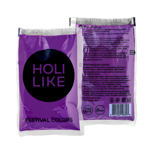 С фестивальной краской Холи Вы сможете устроить яркий фейерверк красок, который сделает любой праздник волшебным. Краски холи HOLI LIKE – это цветные порошки на основе натуральных ингредиентов. Уличные игры с красками холи будут незабываемой игрой для взрослых и детей, которые оставят самые яркие впечатления и положительные эмоции. Цветные краски холи это отличное дополнение к любому празднику: на день рождения, свадьбу, любой другой праздник или просто отдых на природе и фотосессии. Фестивальная краска холи Holi Like непожароопасна, нетоксична, не вредна для кожи и полностью безопасна для здоровья, а также легко отстирывается или стряхивается с одежды. Состав: Термически обработанная злаковая основа, пищевой краситель.