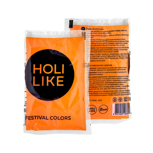 С фестивальной краской Холи Вы сможете устроить яркий фейерверк красок, который сделает любой праздник волшебным. Краски холи HOLI LIKE – это цветные порошки на основе натуральных ингредиентов. Уличные игры с красками холи будут незабываемой игрой для взрослых и детей, которые оставят самые яркие впечатления и положительные эмоции. Цветные краски холи это отличное дополнение к любому празднику: на день рождения, свадьбу, любой другой праздник или просто отдых на природе и фотосессии. Фестивальная краска холи Holi Like непожароопасна, нетоксична, не вредна для кожи и полностью безопасна для здоровья, а также легко отстирывается или стряхивается с одежды. Состав: Термически обработанная злаковая основа, пищевой краситель.