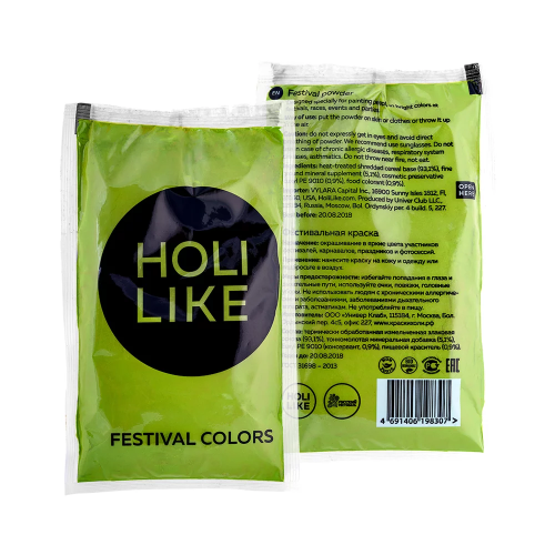 С фестивальной краской Холи Вы сможете устроить яркий фейерверк красок, который сделает любой праздник волшебным. Краски холи HOLI LIKE – это цветные порошки на основе натуральных ингредиентов. Уличные игры с красками холи будут незабываемой игрой для взрослых и детей, которые оставят самые яркие впечатления и положительные эмоции. Цветные краски холи это отличное дополнение к любому празднику: на день рождения, свадьбу, любой другой праздник или просто отдых на природе и фотосессии. Фестивальная краска холи Holi Like непожароопасна, нетоксична, не вредна для кожи и полностью безопасна для здоровья, а также легко отстирывается или стряхивается с одежды. Состав: Термически обработанная злаковая основа, пищевой краситель.