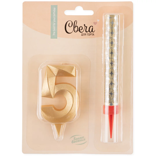 Набор, Фонтан и Свеча Цифра, 5 Грани, Золото, 10 см, 1 шт., 1775