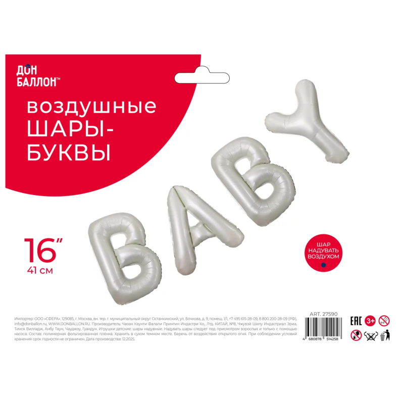 Набор шаров-букв (16''/41 см) Мини-Надпись "Baby", Белый песок, 1 шт. в уп., 27590