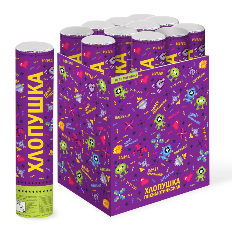 ВНИМАНИЕ: Детям использовать хлопушку только под присмотром взрослых. Не использовать в закрытых помещениях. Направлять в свободное пространство. Не направлять на людей и животных.
