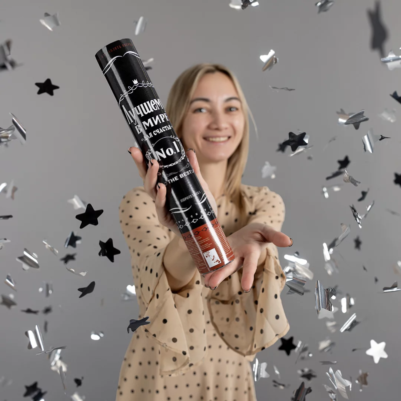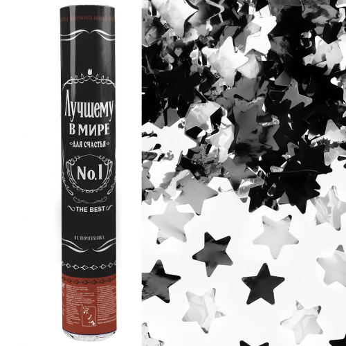 Пневмохлопушка (12/30 см), Лучший В Мире, №1, Звезды фольга, Черный/Серебро, Металлик, 1 шт., 723042