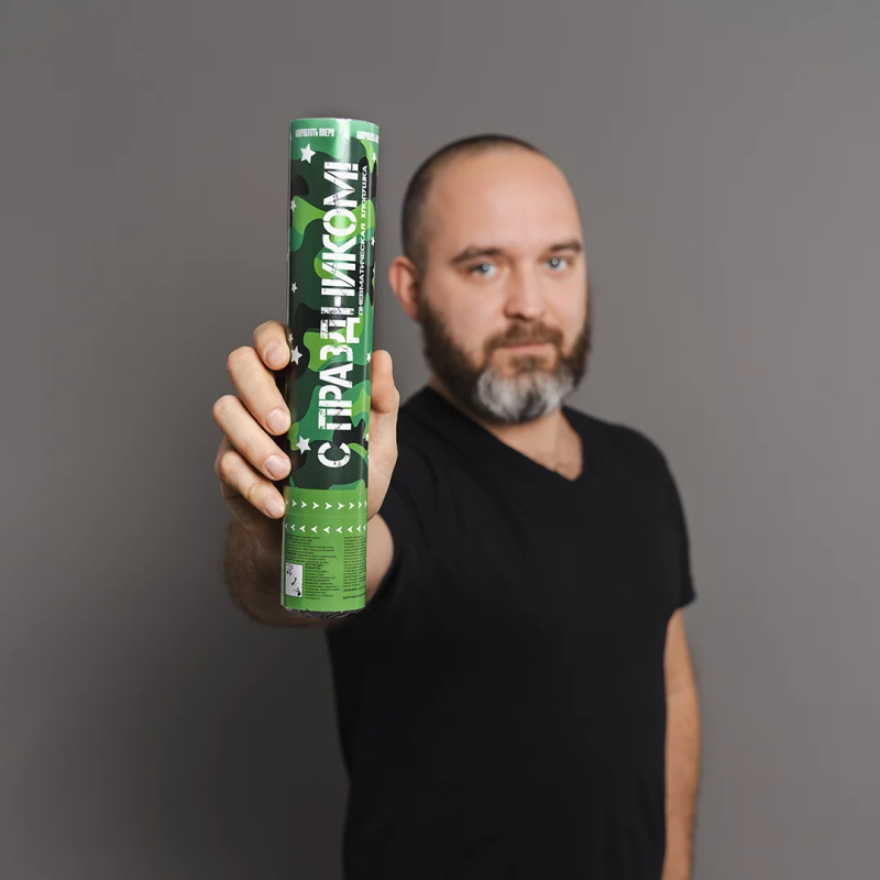 ПРИМЕНЕНИЕ: удерживая хлопушку двумя руками, поверните нижнюю часть (пневматический баллон со сжатым воздухом) по часовой стрелке для «выстрела» конфетти из цилиндра с наполнением.
