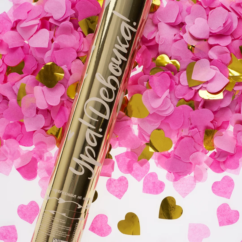 Пневмохлопушка (12/30 см), Ура, Девочка!, Сердца фольга и тишью, Розовый/Золото, 1 шт., 723007