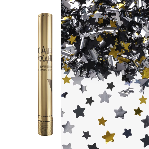 Пневмохлопушка (16/40 см), С Днем Рождения! (HP), Звезды фольга, Золото/Серебро/Черный, 1 шт., 723008