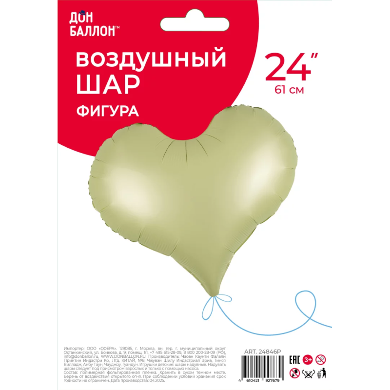 Шар (24''/61 см) Сердце, Люкс, Оливковый, Сатин, 1 шт. в уп., 24846P
