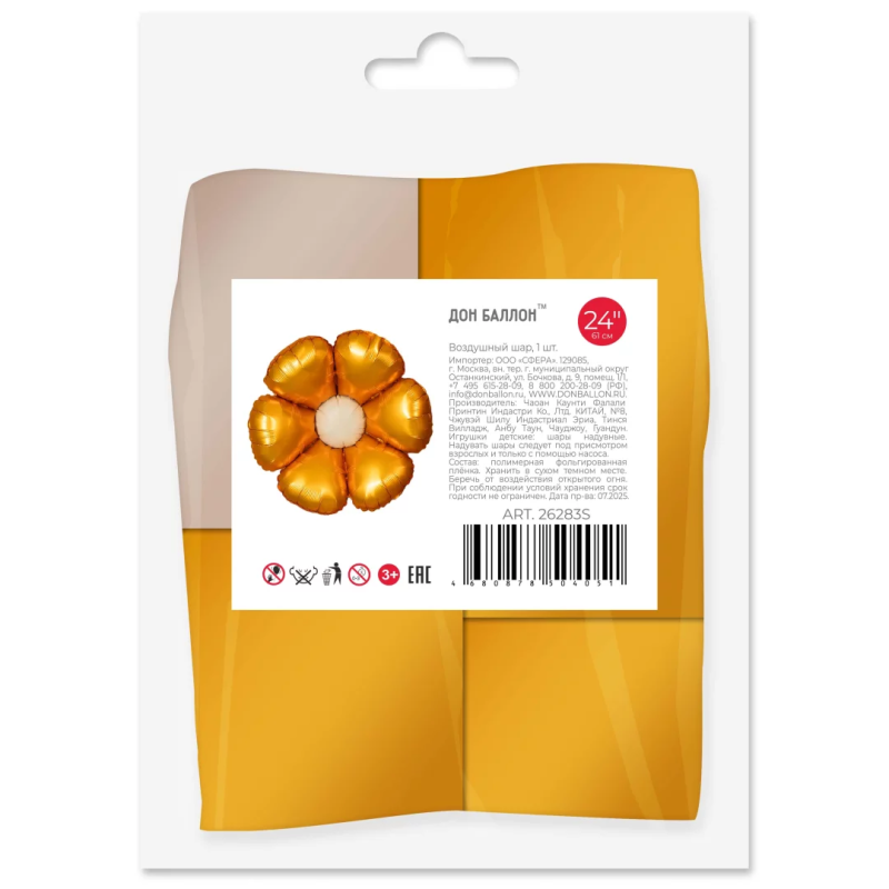 Шар (24''/61 см) Цветок, Ромашка (надув воздухом), Золото, Сатин, 1 шт. в уп. (цв.этик.), 26283S