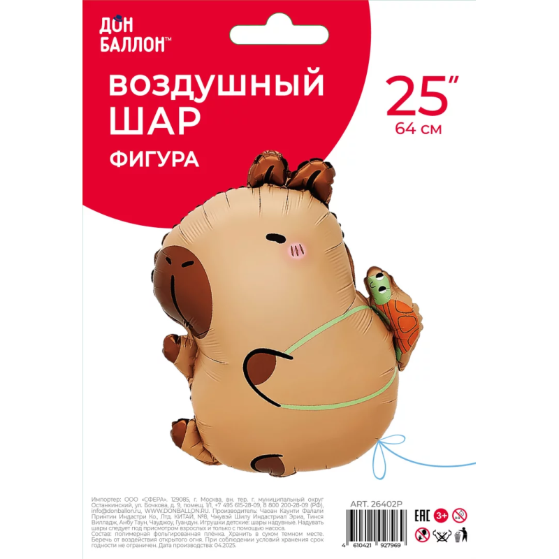 Шар (25''/64 см) Фигура, Капибара с черепашкой, 1 шт. в уп., 26402P