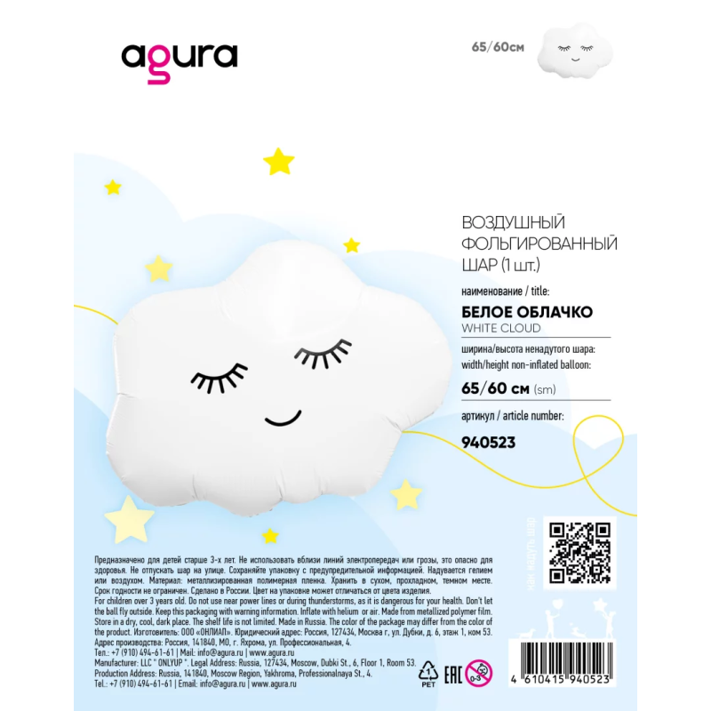 Шар (26''/66 см) Фигура, Белое облачко, 1 шт. в уп., 940523