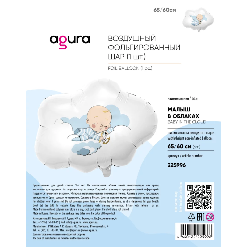Шар (26''/66 см) Фигура, Малыш в облаках, 1 шт. в уп., 225996