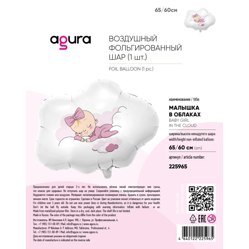 Шар (26''/66 см) Фигура, Малышка в облаках, 1 шт. в уп., 225965