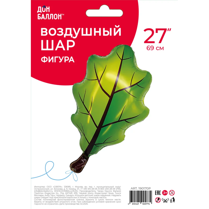 Шар (27''/69 см) Фигура, Дубовый лист, Зеленый, 1 шт. в уп., 190170P