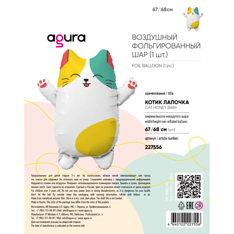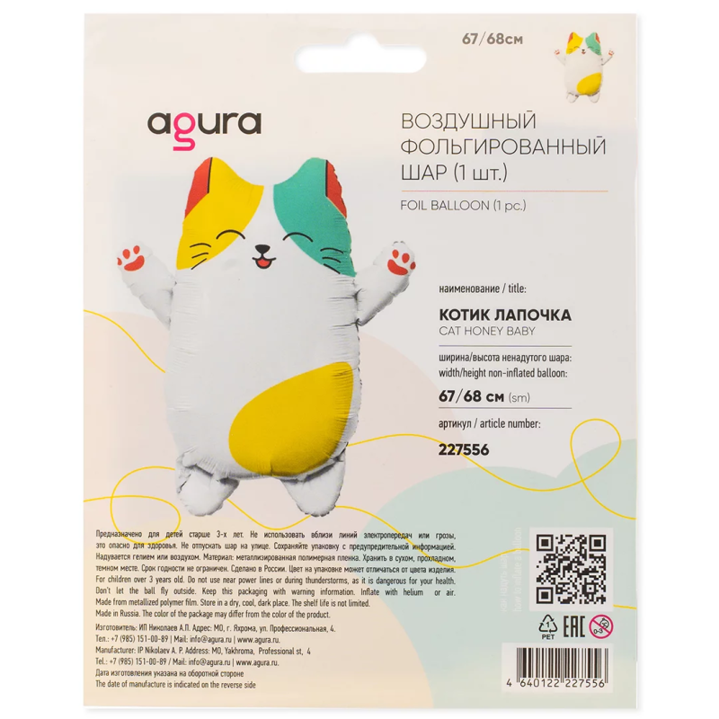 Шар (27''/69 см) Фигура, Котик Лапочка, 1 шт. в уп., 227556
