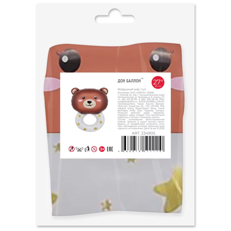 Шар (27''/69 см) Фигура, Погремушка Медвежонок, 1 шт. в уп. (цв.этик.), 23490S