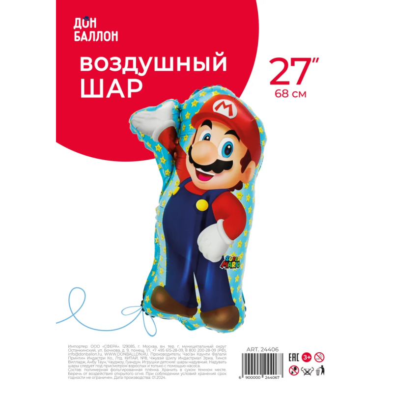 Шар (27''/69 см) Фигура, Водопроводчик Марио, 1 шт. в уп., 24406