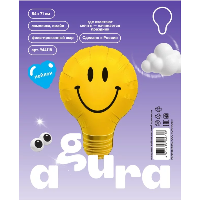 Шар (28''/71 см) Фигура, Лампочка Смайл, 1 шт. в уп., 944118