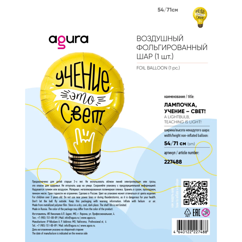 Шар (28''/71 см) Фигура, Лампочка, Учение - Свет!, 1 шт. в уп., 227488