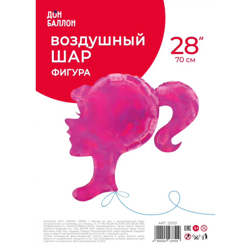 Шар (28''/71 см) Фигура, Профиль девушки, Розовый, Голография, 1 шт. в уп., 23751
