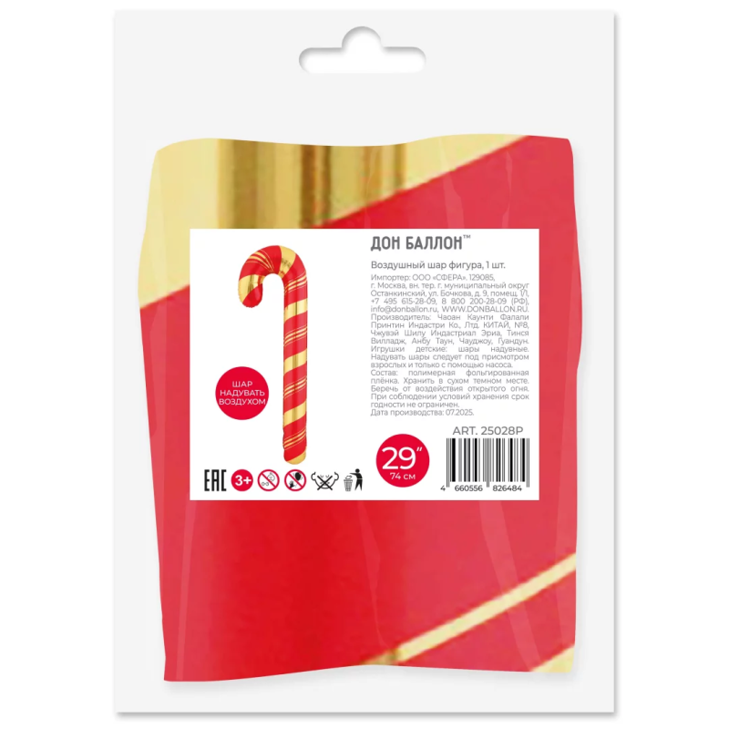 Шар (29''/74 см) Фигура, Леденец трость (надув воздухом), Красный/Золото, 1 шт. в уп., 25028P