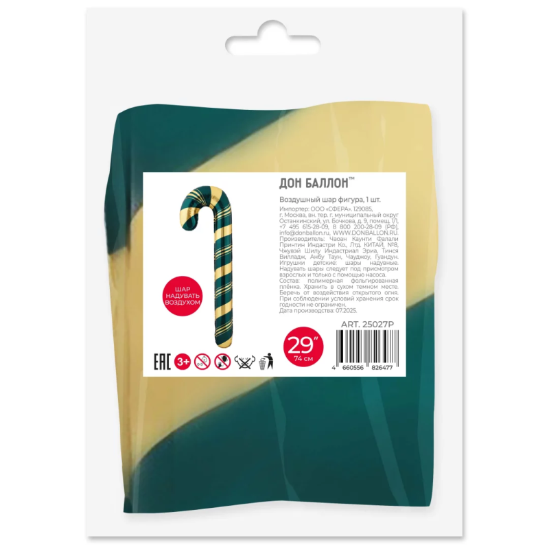 Шар (29''/74 см) Фигура, Леденец трость (надув воздухом), Зеленый/Золото, 1 шт. в уп., 25027P