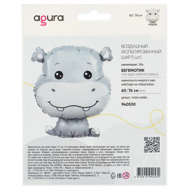 Шар (30''/76 см) Фигура, Бегемотик, 1 шт. в уп., 940530