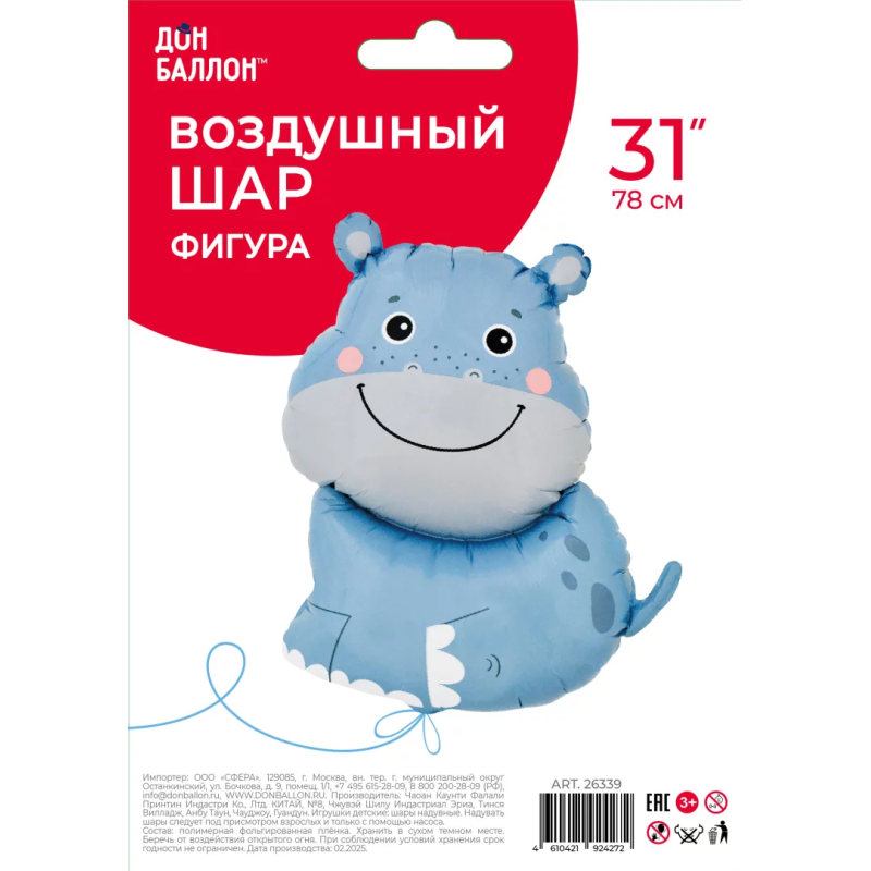 Шар (31''/79 см) Фигура, Бегемотик, 1 шт. в уп., 26339