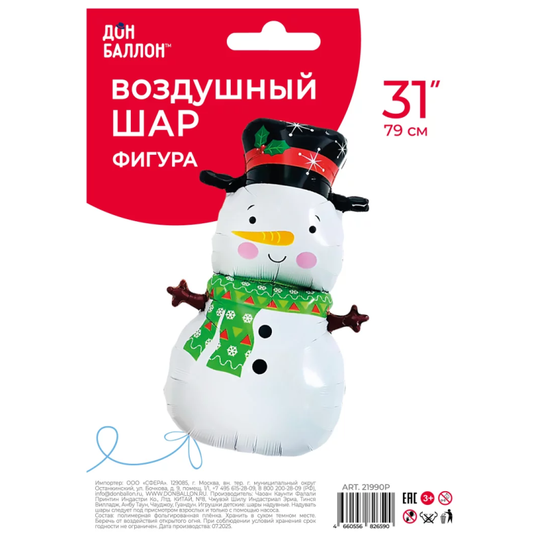 Шар (31''/79 см) Фигура, Снеговик в шляпе, 1 шт. в уп., 21990P