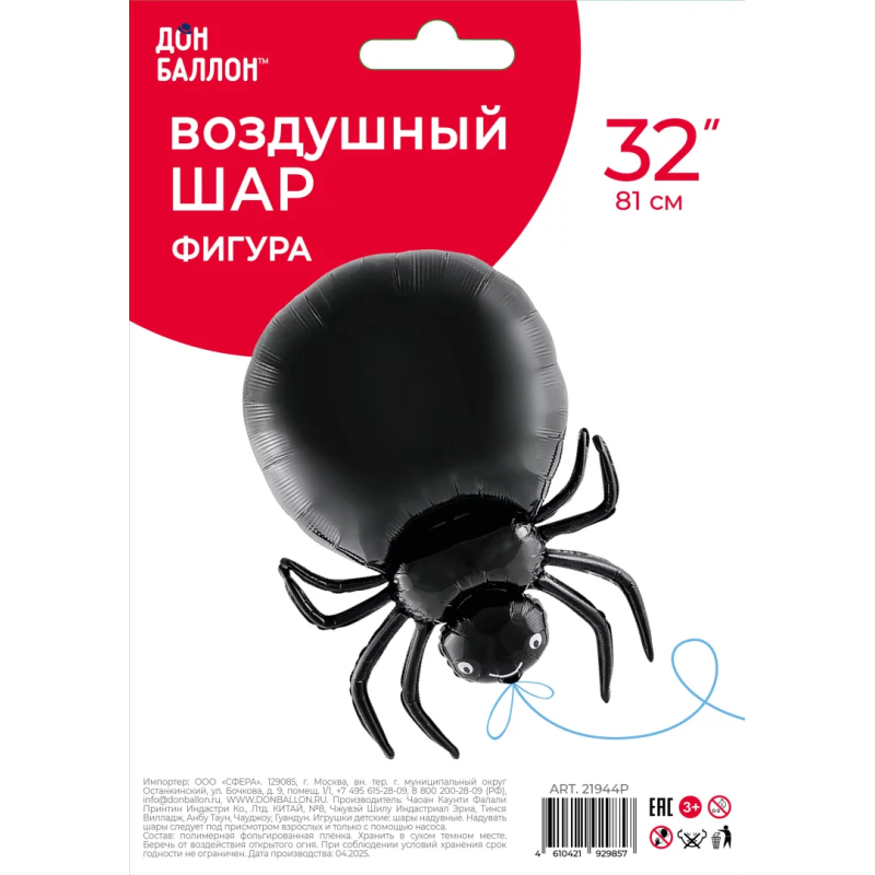 Шар (32''/81 см) Фигура, Паук, Черный, 1 шт. в уп., 21944P
