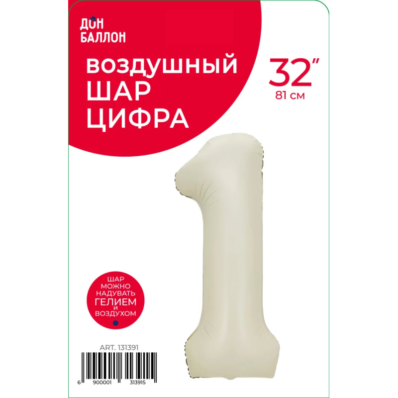 Шар (32''/81 см) Цифра, 1, Белый песок, Сатин, 1 шт. в уп., 131391