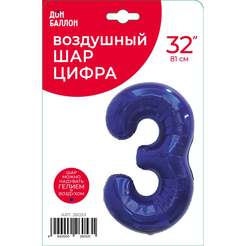 Шар (32''/81 см) Цифра, 3, Темно-синий, 1 шт. в уп., 26053