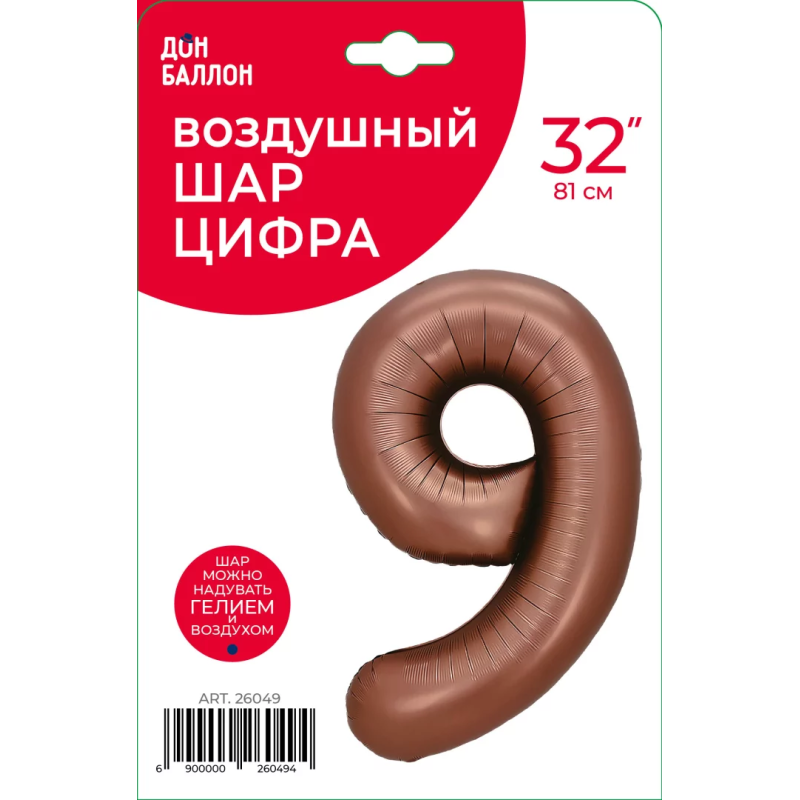 Шар (32''/81 см) Цифра, 9, Шоколадный, 1 шт. в уп., 26049