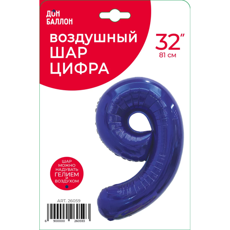 Шар (32''/81 см) Цифра, 9, Темно-синий, 1 шт. в уп., 26059
