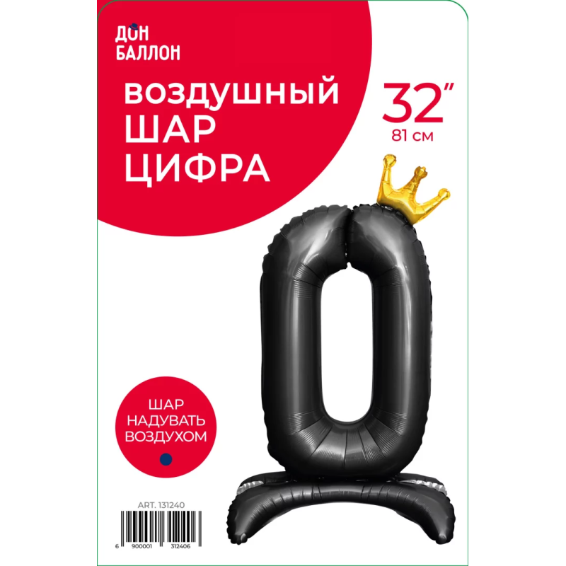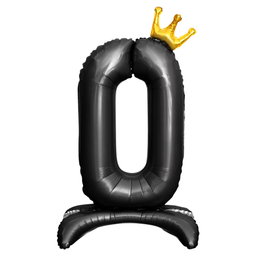 Шар (32''/81 см) Цифра на подставке, 0 Золотая корона, Черный, 1 шт. в уп., 131240