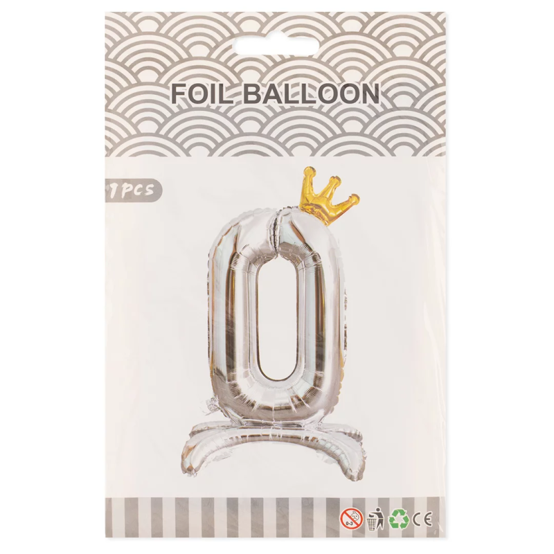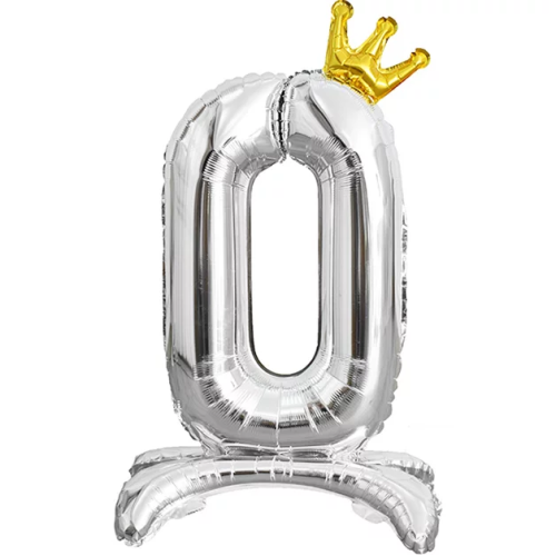 Шар (32''/81 см) Цифра на подставке, 0 Золотая корона, Серебро, 1 шт. в уп., 24170