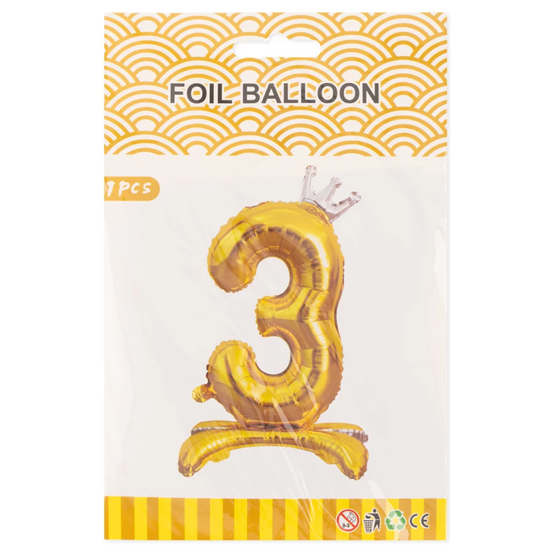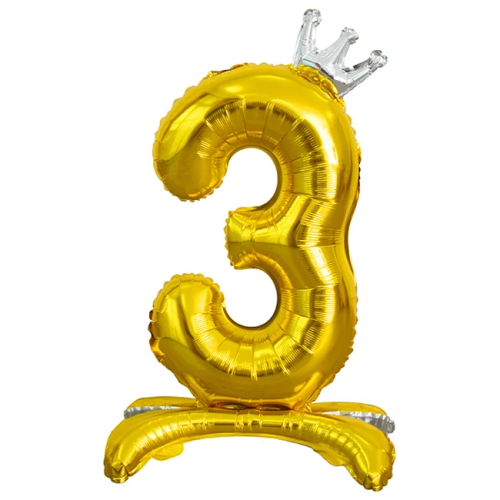 Шар (32''/81 см) Цифра на подставке, 3 Серебристая корона, Золото, 1 шт. в уп., 24183