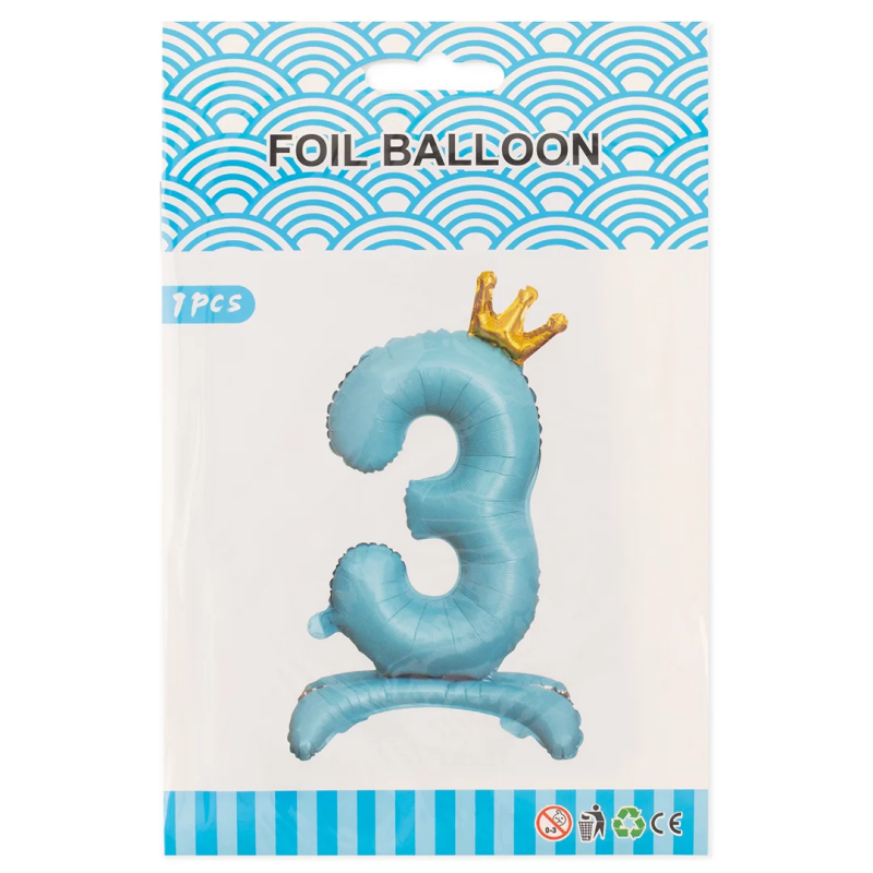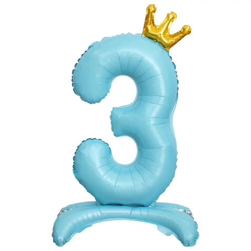 Шар (32''/81 см) Цифра на подставке, 3 Золотая корона, Голубой, 1 шт. в уп., 24203