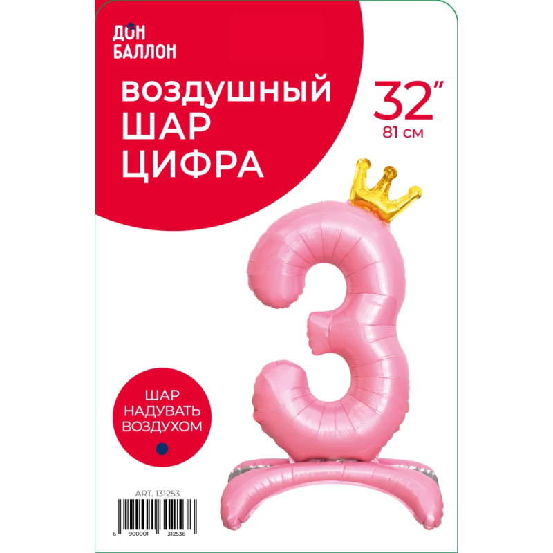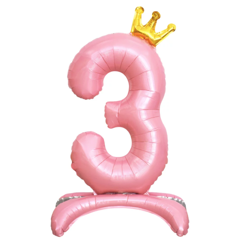 Шар (32''/81 см) Цифра на подставке, 3 Золотая корона, Розовый, 1 шт. в уп., 131253