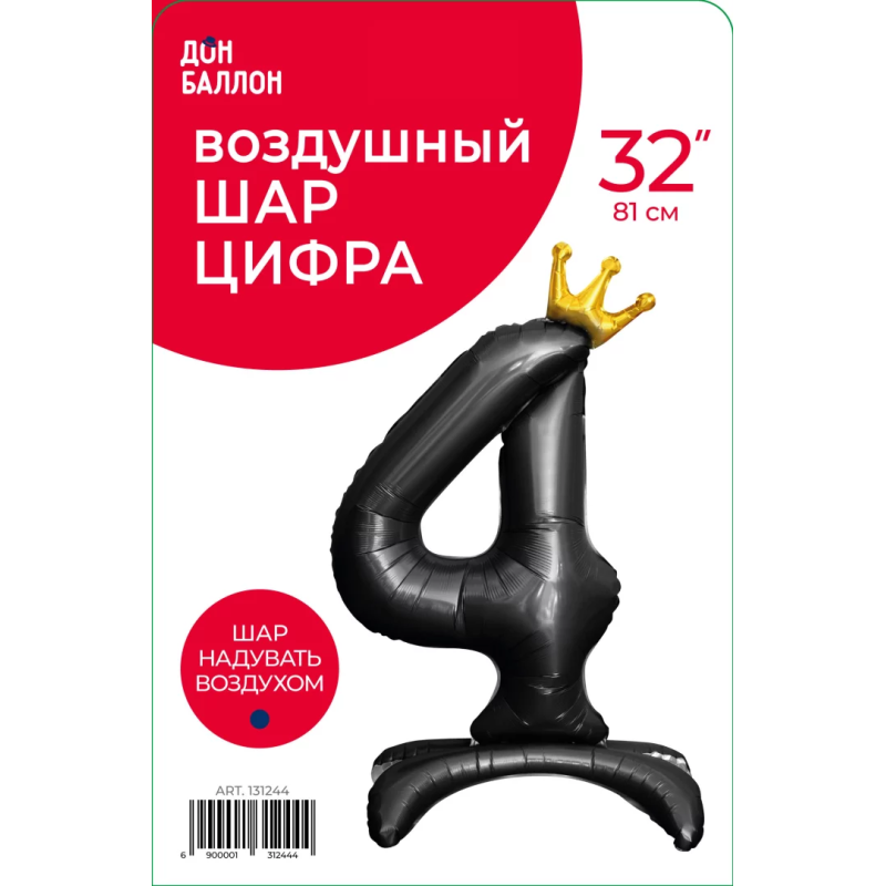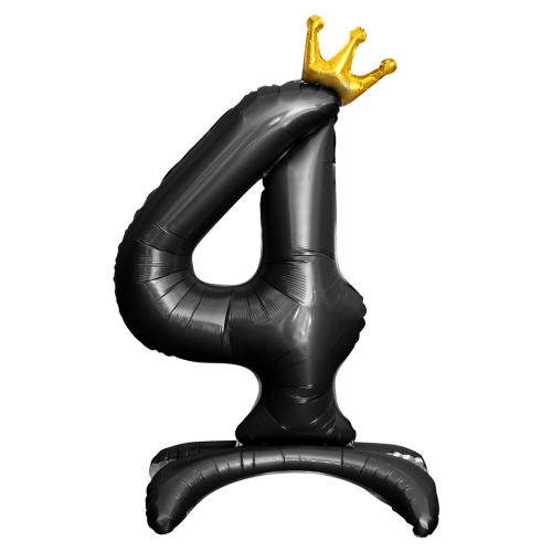 Шар (32''/81 см) Цифра на подставке, 4 Золотая корона, Черный, 1 шт. в уп., 131244