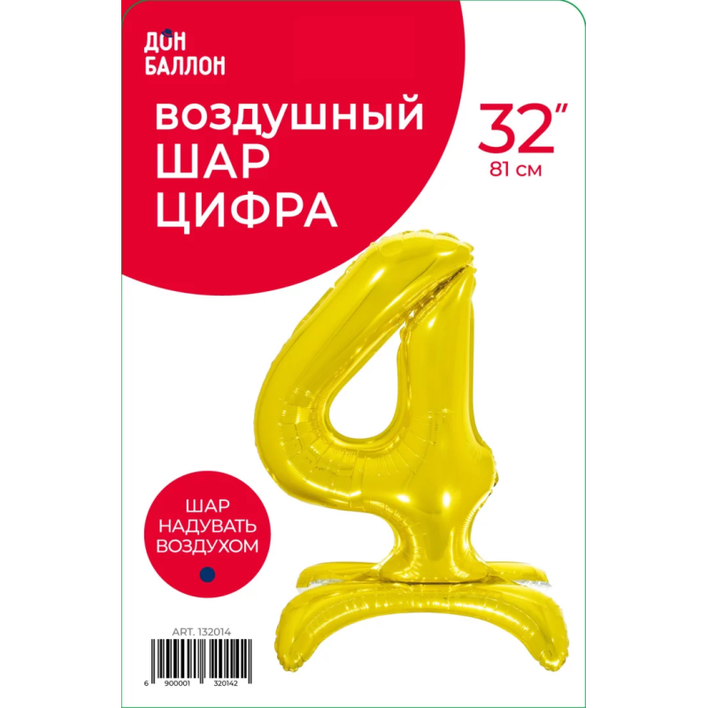 Шар (32''/81 см) Цифра на подставке, 4, Золото, 1 шт. в уп., 132014