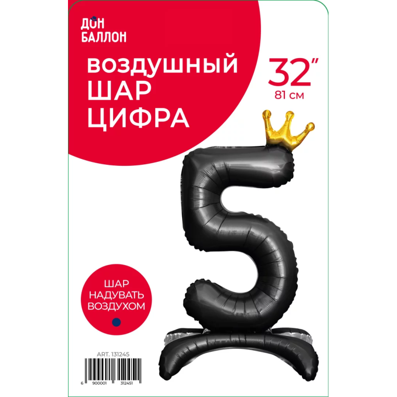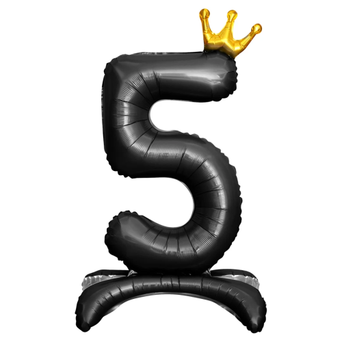 Шар (32''/81 см) Цифра на подставке, 5 Золотая корона, Черный, 1 шт. в уп., 131245