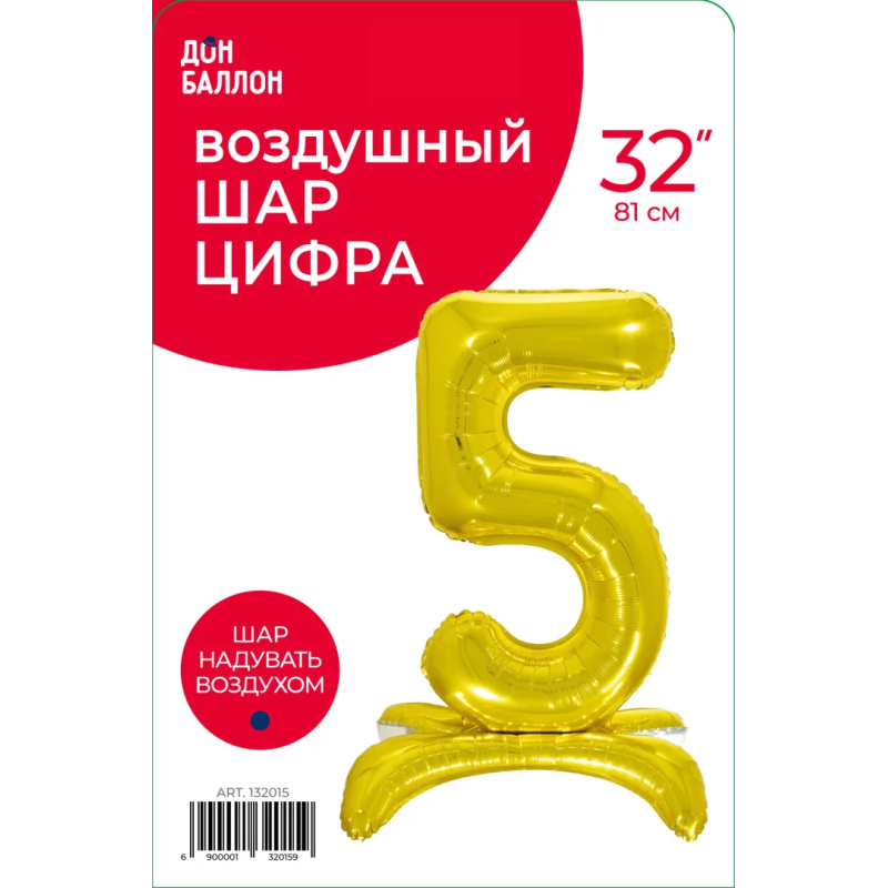 Шар (32''/81 см) Цифра на подставке, 5, Золото, 1 шт. в уп., 132015