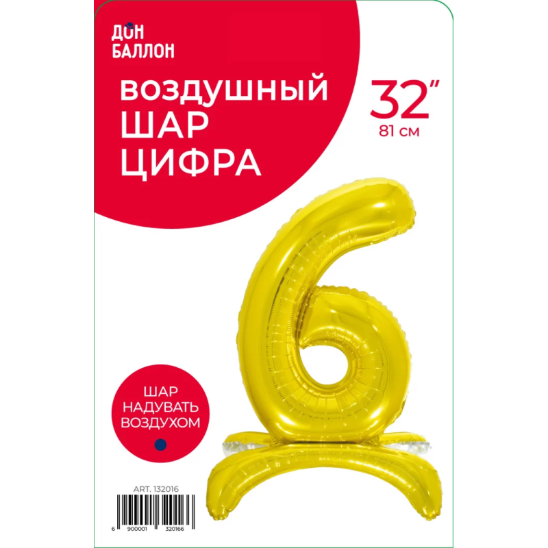 Шар (32''/81 см) Цифра на подставке, 6, Золото, 1 шт. в уп., 132016