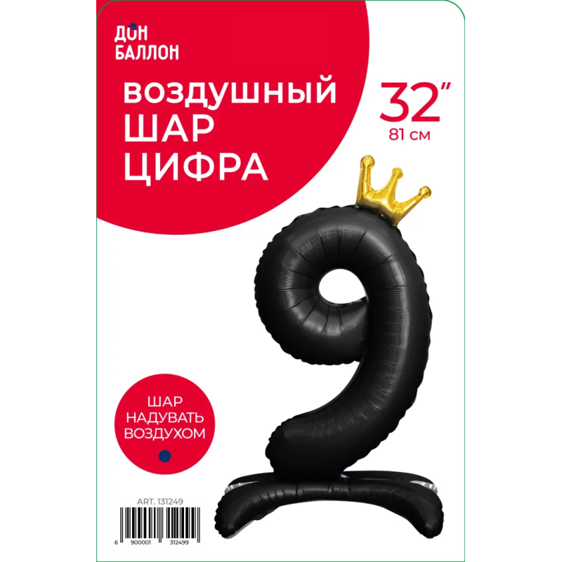 Шар (32''/81 см) Цифра на подставке, 9 Золотая корона, Черный, 1 шт. в уп., 131249